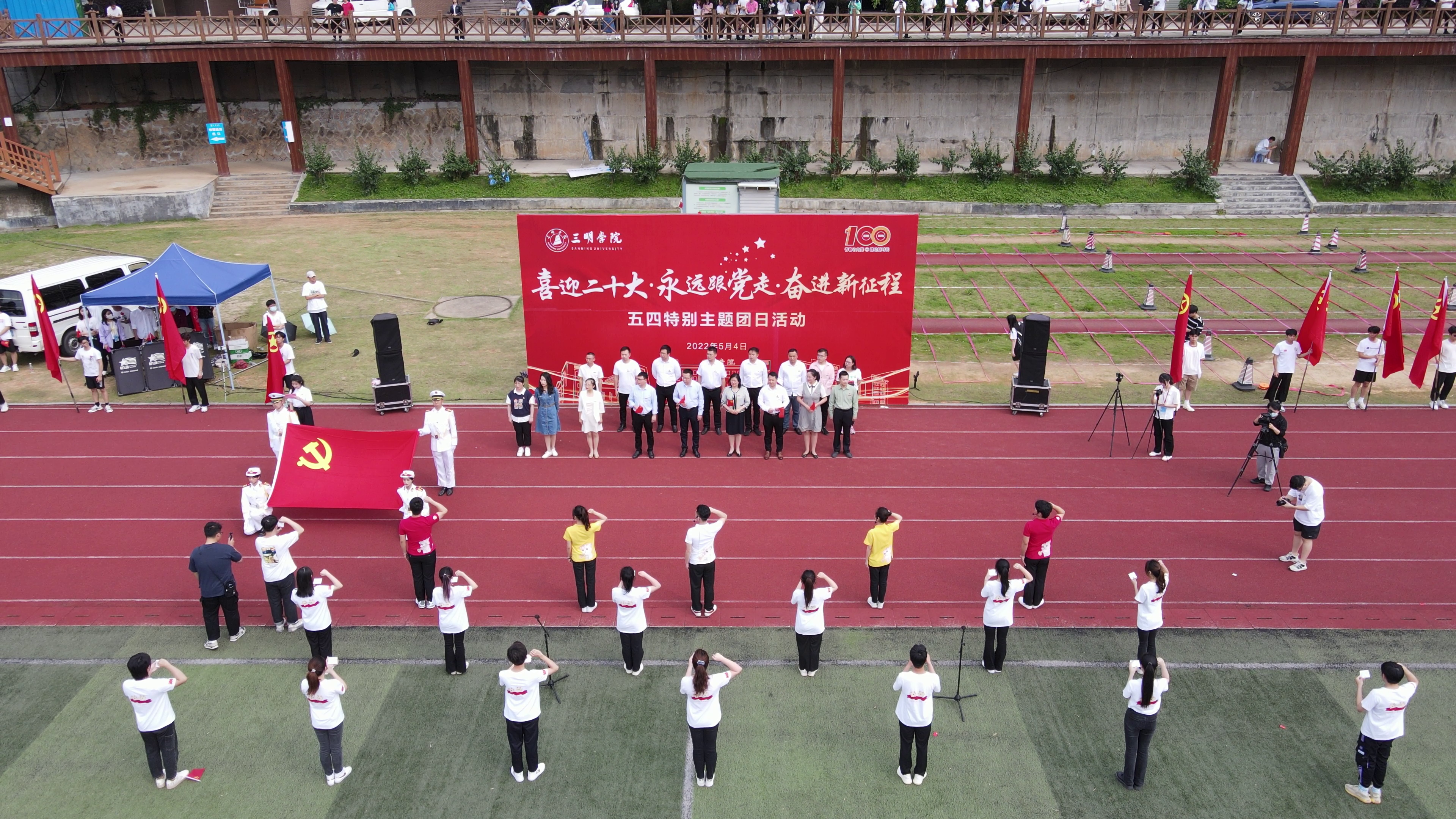 “我们是新时代中国青年,我们以青春的名义承诺……”5月4日下午,一场以“喜迎二十大、永远跟党走、奋进新征程”为主题的五四特别团日活动在三明学院北区田径场举行,540名团员青年面向鲜艳的党旗,郑重许下“请党放心,强国有我”的青春诺言。校党委副书记廖景榕出席活动,宣传部、学工部及校院团委教师代表共同参与。