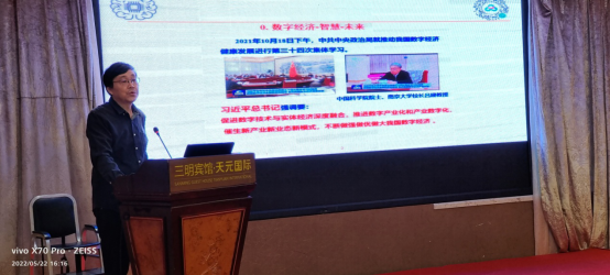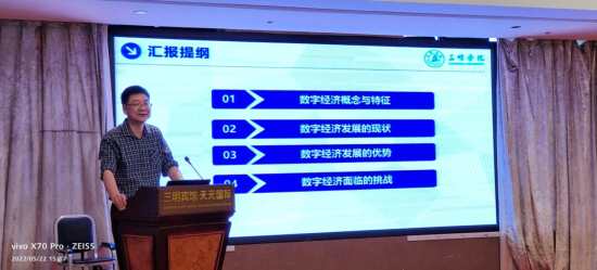 研讨会两位主讲人之一,余晃晶,三明市计算机信息科学学会理事长、三明学院信息工程学院副教授、民进学院支部主任。主讲题目是“我国数字经济发展的优势与挑战”。余会长就数字经济的概念与特征、现状、优势、挑战等四个方面深入浅出地进行阐述,会长长期从事物联网教学与科研,对于数字经济的发展有着十分深刻与独到的见解,使参会人员得到许多启发与思考。