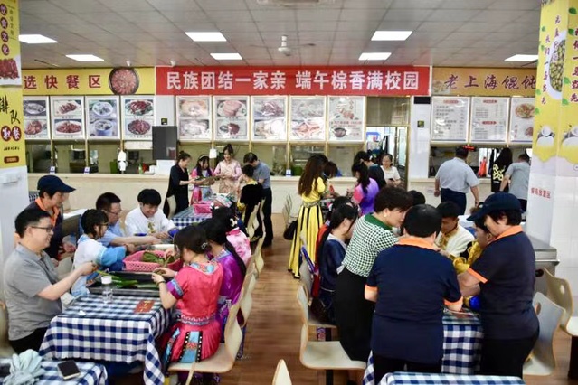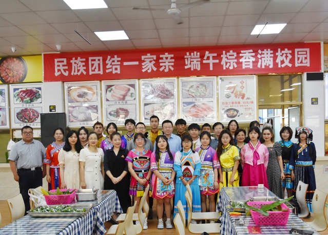 6月1日,来自“石榴籽工作室”的回族、藏族、维吾尔族、白族、苗族、壮族、布依族、瑶族、哈尼族等13个民族20多名学生在南区第六食堂二楼开展“民族团结一家亲,端午粽香满校园”包粽子活动。校领导廖景榕,统战部、学工部、校团委负责人出席本次活动。