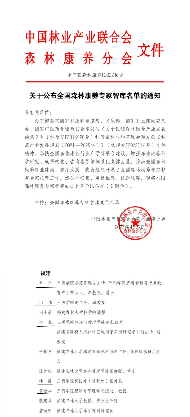 近日,根据《中国林业产业联合会森林康养分会》2022年6号文件公布,通过公开征集、申报推荐、评选程序环节,三明学院经济与管理学院旅游管理系罗金华、林静、石玉、李想和邢伟五位教师成功入选全国森林康养专家智库名单。