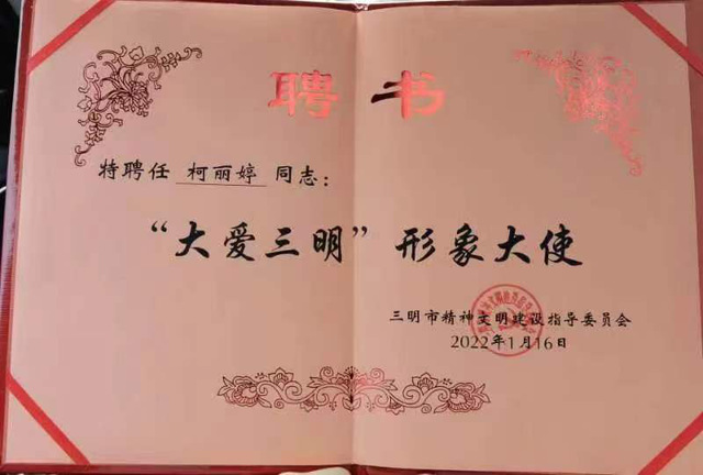 6月14日,我市举行“大爱三明”形象大使聘任仪式,聘任我校教职工柯丽婷为“大爱三明”形象大使。