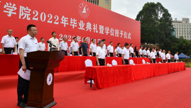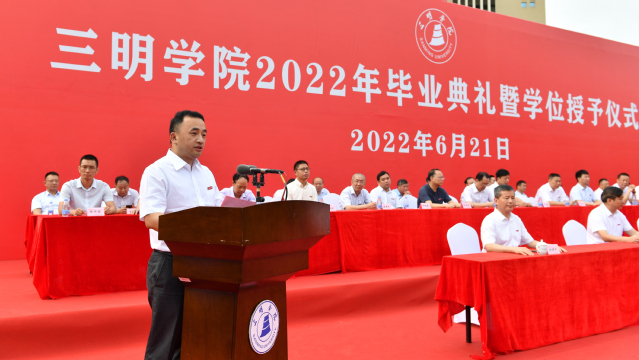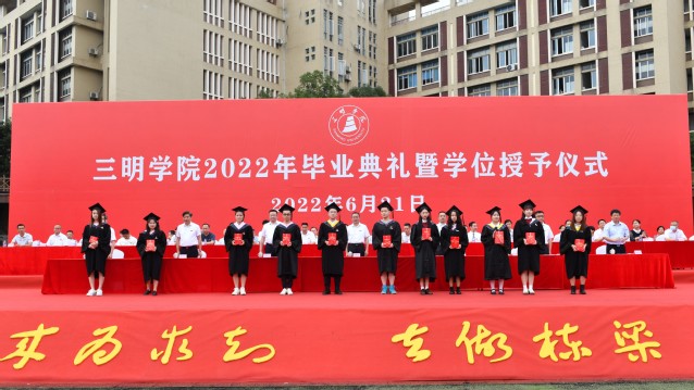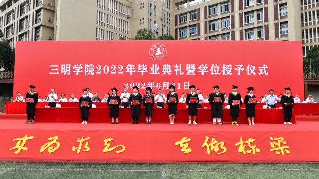 6月21日上午,三明学院2022年毕业典礼暨学位授予仪式在北区田径场和艺术楼音乐厅分两个阶段举行,热烈庆祝三明学院3419名同学完成学业,开启新的人生征途。校领导赖锦隆、王乾廷,廖景榕、张君诚、詹学齐、谢松明、林建伟出席毕业典礼,各部门负责人、各二级学院党政负责人、2022届全体毕业生、毕业班辅导员、教师代表以及校友代表参加。典礼由校党委副书记廖景榕主持。