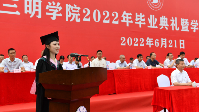 王乾廷校长代表学校在典礼上致辞。他向2022届全体同学表示热烈的祝贺,向为同学们的成长倾注心血和汗水的老师们致以崇高的敬意,向关心支持三明学院发展的各级领导、各界人士表示衷心的感谢。致辞指出,学校美丽如画,在这座文化深厚、韵味雅致的象牙塔里,问知求识,修身养习,不负青春韶华;学校以立德树人为根本任务,五育并举,造就可堪大任之才;学生生活五彩缤纷,活力无限,展示出明院学子的朝气蓬勃和积极向上的风貌。王校长与同学们共同学习习近平总书记视察宜宾学院时的重要讲话精神,寄语2022届毕业生,要不断提升品德修养;要正确认识自身和社会需求的关系,保持平实心态择业就业,工作深造;要形成终身学习的习惯;要树立梦想,不断提高能力,建功立业,牢记母校培养,努力为母校争光。