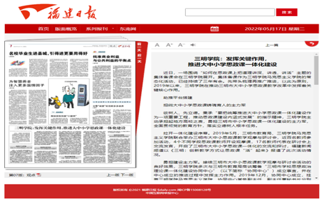 学院党总支在推进大中小学思政课一体化建设中勇担当、求作为,推动了立体化地方特色教材建设、系统化立德树人课程建设、多样化教学实践载体建设、一体化师资队伍建设、共享化教学资源平台建设,形成大中小学同心同德办好思政课的系统合力。成果入选福建省新时代党建优秀案例。相关经验和做法被《福建日报》《福建教育工作简报》《学习强国》《福建高校思政网》等媒体报道推广。