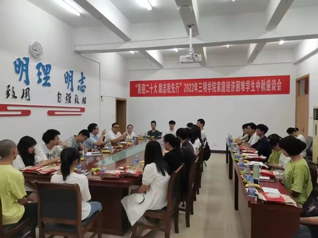 紫荆园7号楼活动现场,DIY月饼制作、猜灯谜、博饼活动热闹非凡。师生携手配合,共同完成一个个月饼的制作,用实际行动开设了一堂生动的劳动教育实践课。南区学生活动中心会议室,学工部举办“喜迎二十大 励志我先行”2022年三明学院家庭经济困难学生中秋座谈会,关心慰问他们在学校的学习生活,提高资助育人工作精准性与实效性,切实帮助他们解决实际困难,增强学生感恩责任奉献意识,助力学生成长成才。