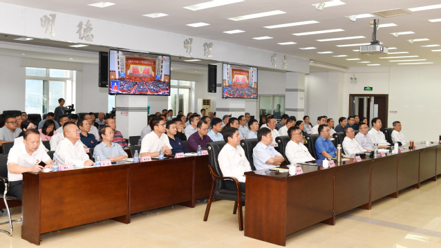 在行政楼八楼会议室,学校领导赖锦隆、王乾廷、廖景榕、张君诚、吴龙、谢松明、林建伟、游龙桂和全校副处以上领导干部集中收听收看。