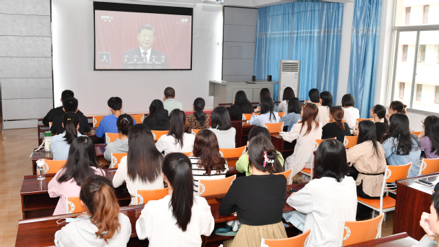 各二级学院党委副书记、辅导员与本单位全体师生一同在教学楼、宿舍收听收看。