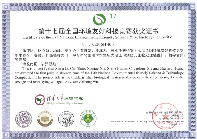此次竞赛由资源与化工学院吴志鸿教授牵头,福州大学联合培养硕士毕业生汪翔协同指导,2020级资源环境科学林心如、夏学娇、黄诗婕、黄水玲,以及2020环境工程汤灿、谢成龙,共计6位同学组成的科研创新团队,凭借科技理念作品《一种可净化生活污水暨放大电压的滴滤式生物处理装置》,以及出色表现,最终荣获华南赛区一等奖(科技理念类)。