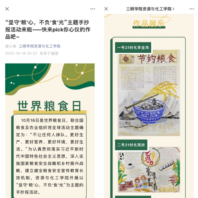 为认真贯彻落实习近平新时代中国特色社会主义思想,深入实施国家粮食安全战略和乡村振兴战略,资源与化工学院认真谋划,精心组织,以“保障粮食供给 端牢中国饭碗”为主题开展丰富多彩的系列宣传教育活动,引导全院师生思想上感悟盘中粒粒辛苦,用实际行动弘扬中华民族爱惜粮食、节约粮食的优良品质。