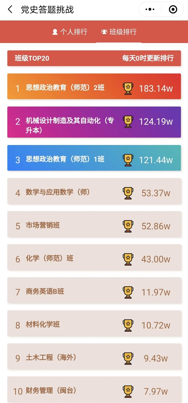 十月中旬,历时近一个月的三明学院2022级新生党史学习挑战赛落下帷幕,全校12个学院63个新生班级共计993名同学热情参赛,将理论学习融于日常。