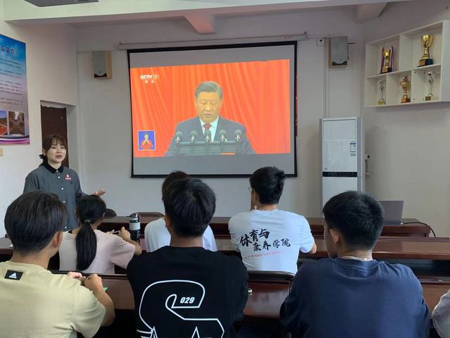 视频学习悟精神。“我们要坚持教育优先发展、科技自立自强、人才引领驱动,加快建设教育强国、科技强国、人才强国……””社会体育指导与管理专业学生党员在支部书记的带领下再次观看中国共产党第二十次全国代表大会开幕会,再次聆听习近平总书记铿锵有力的话语。字字珠玑、掌声阵阵,支部党员从热烈的会议氛围中感悟党的二十大报告中坚不可摧的精神力量。
