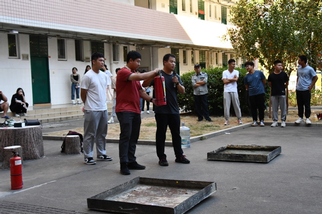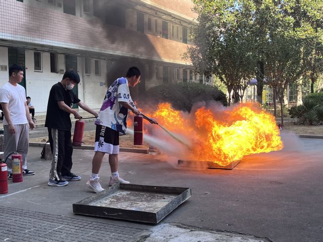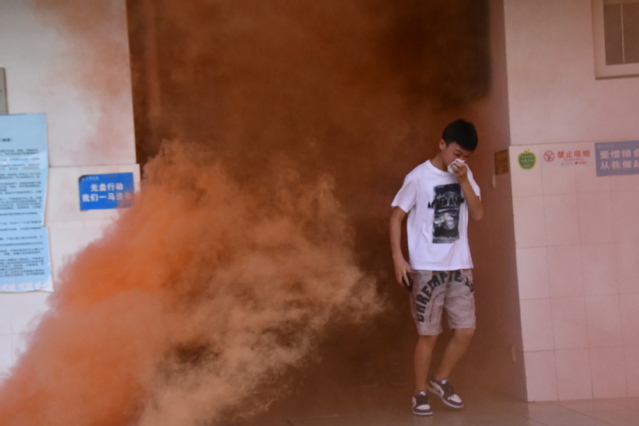 随着工作人员燃放烟雾弹,信号员吹响哨子,宿舍内的同学们弯着腰、捂住口鼻沿着指定路线快速撤离,并有序到宿舍空地集合,随即各班班长清点人数,有序上报。演练现场,保卫处消防科副科长罗仁杯老师讲解了干粉灭火器的使用方法并进行灭火演示,部分学生现场参与现场灭火操作。最后,罗老师对本次消防疏散演练进行了总结,提出了在疏散中存在的一些不足之处,提醒同学们要提高自护自救能力,消防安全必须严抓不懈,防患未然。