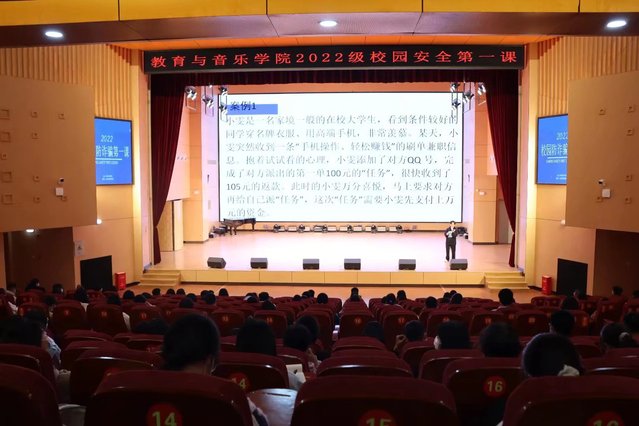 2022年11月2日,教育与音乐学院于艺术大楼演艺厅开展校园防诈骗宣讲活动。本次活动邀请荆东派出所和校园安全宣讲团成员为学院2022级新生进行宣讲。