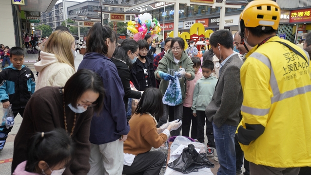 活动现场,艺术与设计学院三位专业教师带领服装设计专业的同学借通过文化与技艺传习的方式,向群众介绍着草木染文化,并示范传授草木染工艺。运用纱、线、绳等工具,对织物进行扎、缚、夹等形式固定后进行染色。经染色,小小的一块方巾白布像变魔术一样产生了奇妙的变化,各式纹样遍布于方巾中。街头群众的兴趣被激发出来,纷纷动手尝试,甚至连“美团小哥”都来围观。在师生们的讲解与指导下,群众纷纷参与到草木染的制作体验中,从扎结、浸水到染色,亲身感受和体验一块块白布在自己的手中变成了绚丽多彩的作品,体验成功的喜悦和快乐,并将一幅幅纹样精美的草木染方巾带回家,将自己亲手体验的文化与技艺成果引进家。