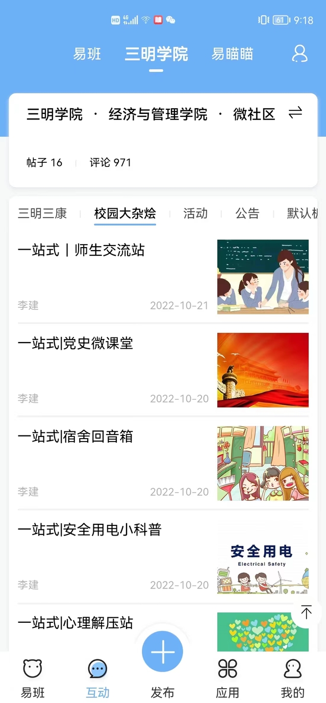 打造平安高校样板高地是学校一站式社区服务的基本要求。通过整合云端资源,依托易班平台,搭建青年人可接受、可享受的学习、生活、娱乐综合信息服务功能需求的“网络社区”,致力于打造成学院立德树人、思政育人的宣传主阵地;打造成社区师生交流沟通、释放压力的互动新平台;打造成同学们建言献策、反馈需求的发声新渠道。在易班平台开通辅导员心理健康在线咨询,实现心理咨询、个案帮扶、危机干预。通过易班平台开展防诈骗线上考试,为学生开展各类反诈骗知识宣传,争创“无诈宿舍”“无诈楼栋”“无诈社区”。