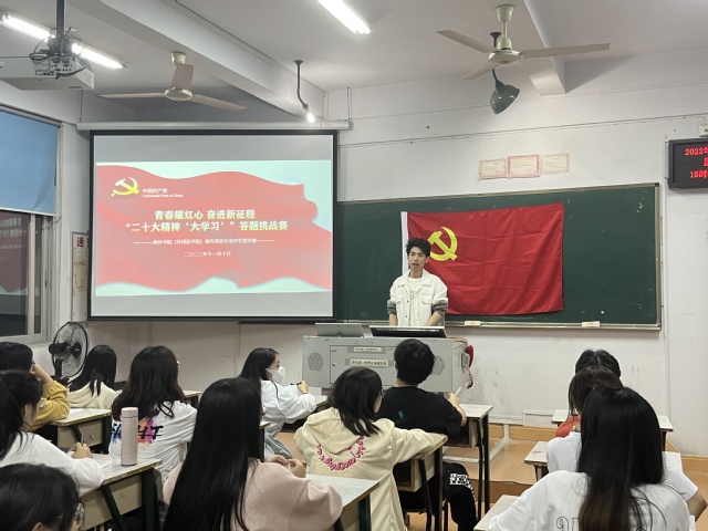 2022年11月10日,海外学院(外国语学院)商务英语专业学生党支部于外语楼A405开展“青春耀红心,奋进新征程”党的二十大精神主题教育,支部全体党员参加。