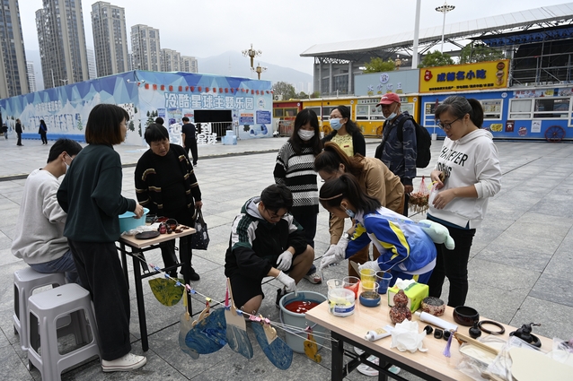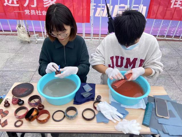 活动中,学生党员向参与者介绍中国传统大漆工艺技艺,并展示精美漆艺术品,带领大家赏析大漆技法、感受漆韵之美。群众通过观察、触摸、交流,提高了艺术审美能力和漆艺鉴赏能力。艺术与设计学院师生通过犀皮漆镇尺为例,为群众介绍各类工序步骤和技法要点,带领大家体验漆器研磨和漆团扇的制作。活动现场氛围热烈,在师生的指导下,与市民共同创作了58把漆扇,研磨了3个漆葫芦、1个手镯以及2个镇尺。在亲力亲为的参与中,市民深刻感受到,工艺美术的完美呈现,离不开工匠精神与匠人之心。