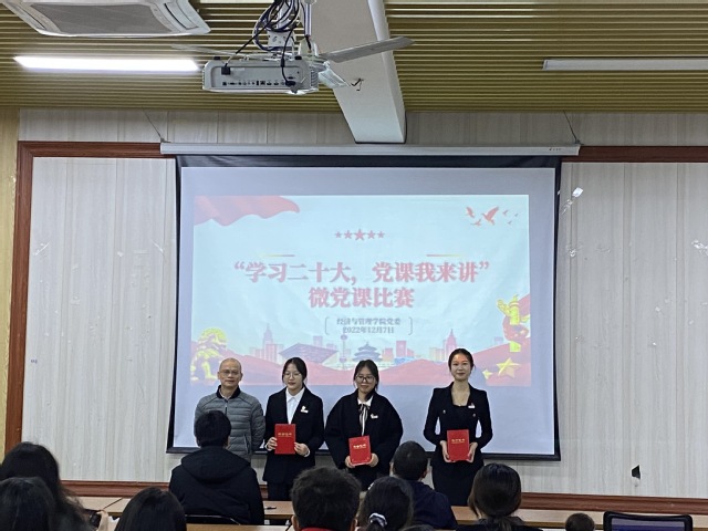 12月7日,经济与管理学院在厚德楼304举办“学习二十大,党课我来讲”微党课比赛。院领导班子成员、师生党员代表参加活动。