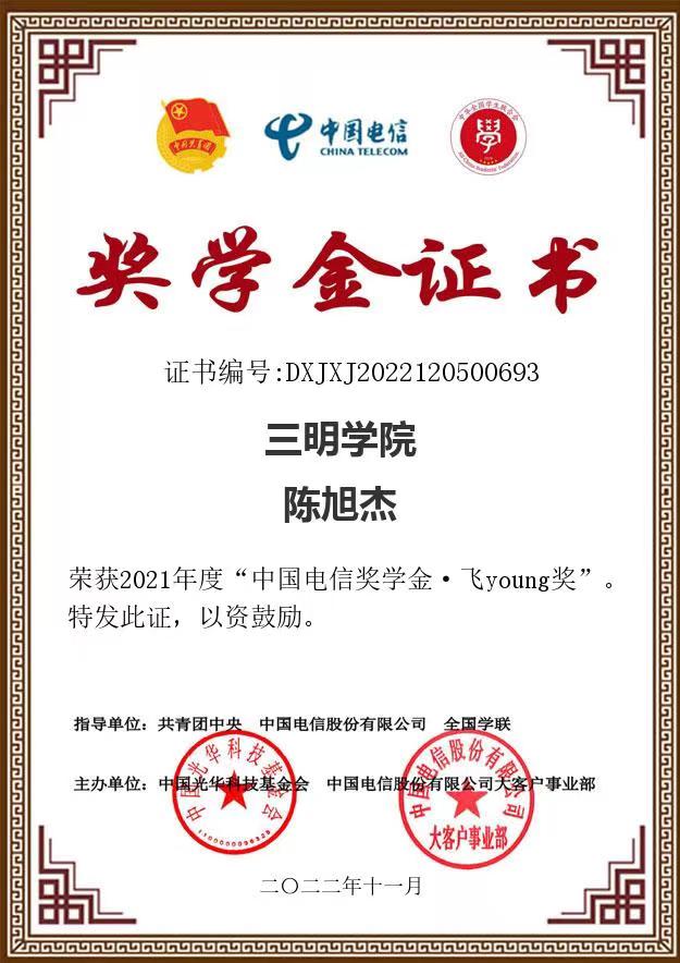近日,由共青团中央、全国学联指导中国电信集团有限公司、中国光华科技基金会联合举办的2021年度“中国电信奖学金”评选结果正式揭晓,三明学艺术与设计学院2019级视觉传达设计专业陈旭杰同学荣获“中国电信奖学金·飞Young奖”称号。