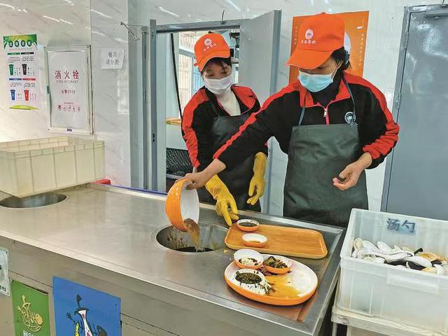 餐盘回收处,摆放着3个60升装的厨余垃圾桶和一个用于其它的垃圾桶。肖春华告诉记者,用餐高峰期会有3名工作人员专门负责学生餐盘里食物的分类和回收。而其它垃圾桶,则用来回收塑料袋、餐巾纸及食物包装袋等垃圾。