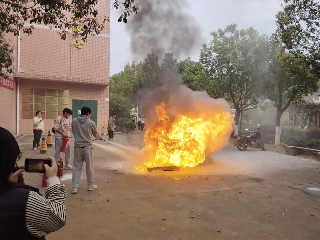 随着警报声响起,同学们用毛巾捂住口鼻,低姿势弯腰前行,从实验室快速、有序地沿着指定路线撤离到安全地带。随后保卫处老师讲解了如何使用干粉灭火器进行灭火,并现场进行演示,部分学生参与了现场演示。