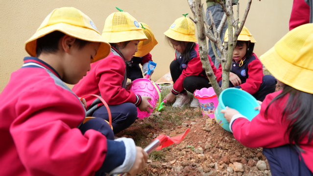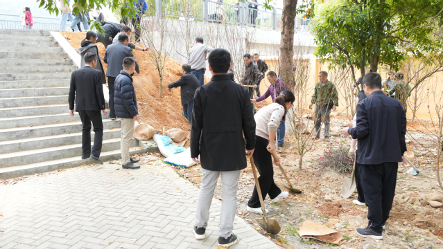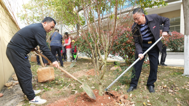 扶苗、施肥、培土、浇水……植树现场,大家三五人一组分工配合,完成了60余株碧桃树苗的种植工作,为校园增添一道新的风景线。