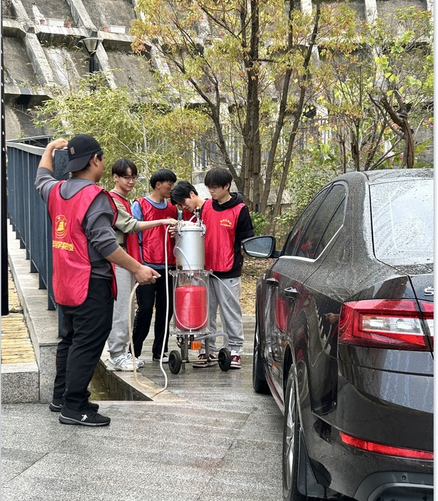 学生党员曾湘铭表示:“洗车设备是由党支部成员在夏泽斌老师的指导下所设计的水动力泡沫机项目产品,该项目申请了‘一种新型泡沫清洗装置’等多项专利,并在‘互联网+’大赛中获得省级银奖,具有较高的社会价值。”