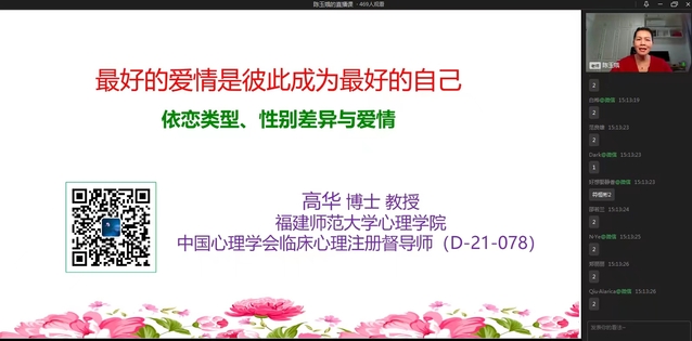 为深入践行党的二十大报告“要重视心理健康和精神卫生,深入开展健康中国行动”。3月14日,福建师范大学心理学院高华教授应邀以《最美的爱情是彼此成为最好的自己》为题开展线上直播讲座。校学生处负责人主持,校心理中心老师、各学院心理联络员及1000余名学生全程线上点赞观看。