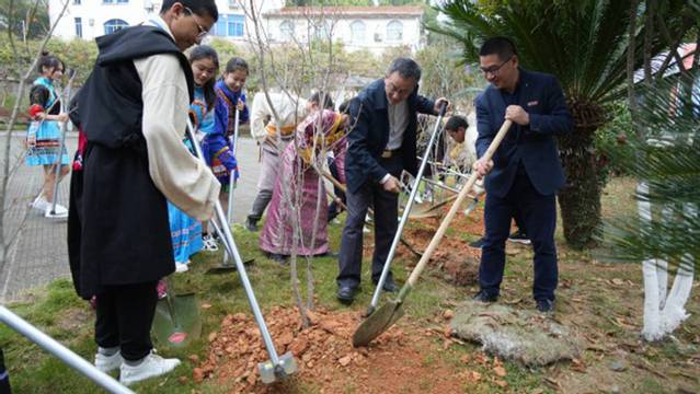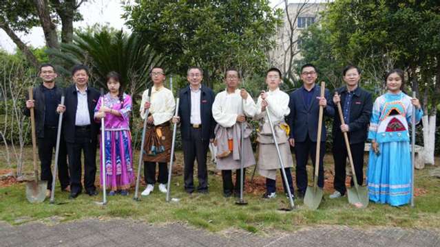 “我要为第二故乡种下一棵树”,列东中学西藏班旦增曲扎激动地说道。恰逢植树节,启动仪式后,三明学院石榴籽广场活动现场,两校师生三五成组,或挥锹铲土、或扶树正苗、或浇水培土,相互协作共同种下56棵承载着深厚民族情谊的“同心”石榴树。