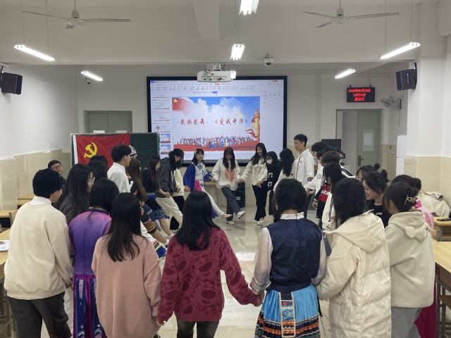 学生党员与少数民族学生共同表演了诗歌朗诵《红红的石榴籽》、歌伴舞《爱我中华》。伴随着《爱我中华》的歌声,师生一起手拉手围成圈跳起圆舞曲,全场弥漫着欢乐的笑声和浓厚的民族舞气息,将本次主题党日活动推向了高潮。