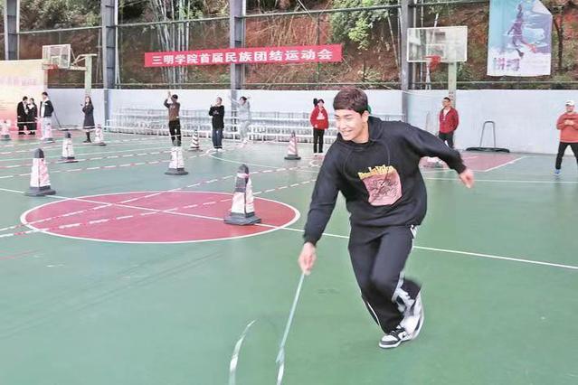 3月29日,三明学院举办首届民族团结运动会,吸引全校各民族学生450人参加。运动会以“民族团结一家亲 福籽同心爱中华”为主题,设置板鞋竞速、抛绣球、滚铁环、顶罐接力走、大象拔河5个项目,通过同场竞技,增进全校各民族的交流,铸牢中华民族意识共同体。图为选手正比拼滚铁环项目。