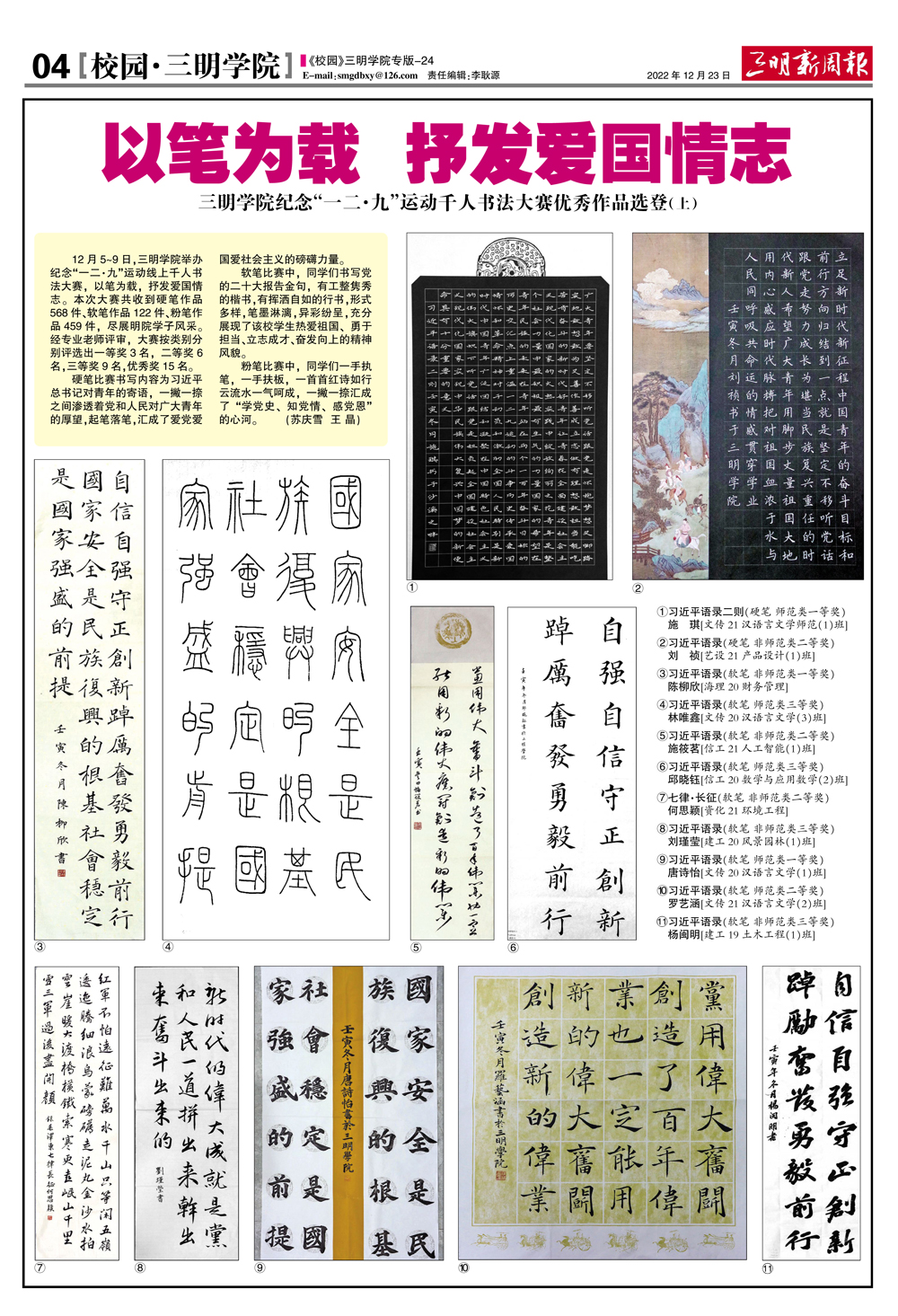 【三明新周报】以笔为载 抒发爱国情志——三明学院纪念“一二·九”运动千人书法大赛优秀作品选登