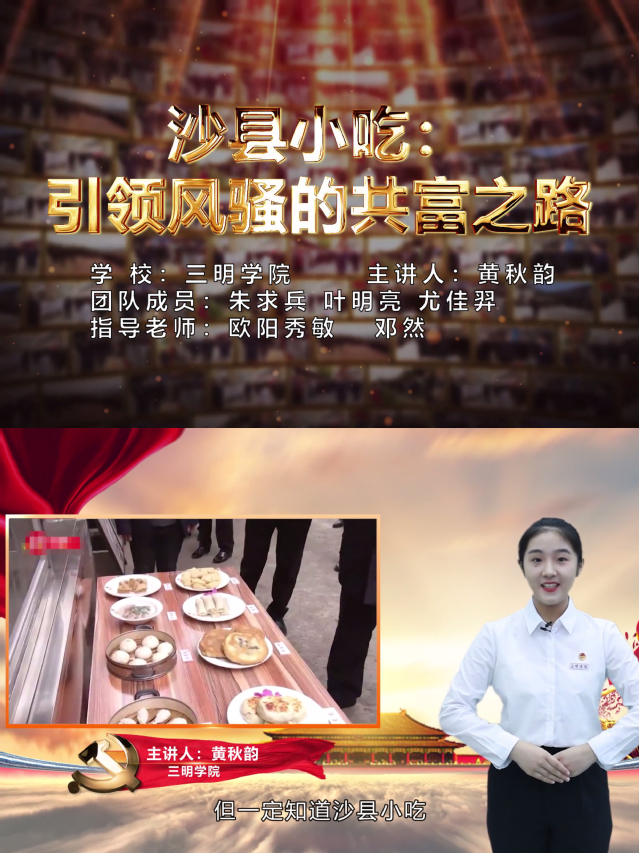 近日,习近平新时代中国特色社会主义思想大学习领航计划系列主题活动之“青春献礼二十大 强国有我新征程”——第六届全国高校大学生讲思政课公开课展示活动评比结果揭晓。由三明学院马克思主义学院教师欧阳秀敏、邓然指导的《沙县小吃:引领风骚的共富之路》(学生主讲人:黄秋韵)荣获全国本科组优秀奖。