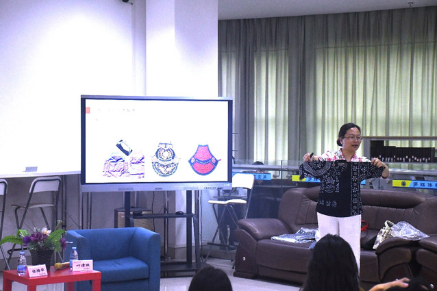 活动现场,叶清珠老师介绍了其专著《传统客家蓝染技艺与现代活化发展研究》的内容,与同学们分享该书的创作背景和创作过程,展示她多年以来收藏的客家蓝染服饰,解读服饰中蕴含的内涵,引导同学们围绕着读书感悟进行了一场深刻的思想交流,并对现场学生们的提问一一作了解答。“蓝染的活化传承需要毅力和能力”,她勉励同学们努力学习,学好专业,为中华优秀传统文化的创造性转化和创新性发展做出新贡献。