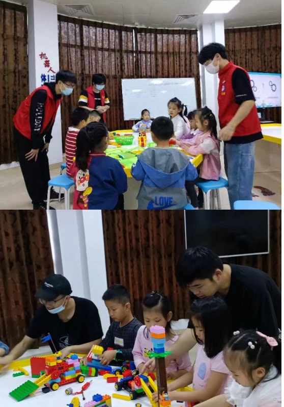 教学中,孩子们被分为幼儿组和少儿组,志愿者通过PPT给孩子们从一个个小零件到乐高的运行原理讲起,耐心为孩子们解答各种问题。通过寓教于乐的方式,把教学和娱乐相融合在一起,在志愿者的带领下,孩子们发挥丰富的想象力,做出了弓箭,小车等作品,射击旗帜,小车竞速,孩子们在学中玩,玩中学,培养了观察力,专注力和动手能力,增强了动手与创新能力,解决问题的独立思考能力。