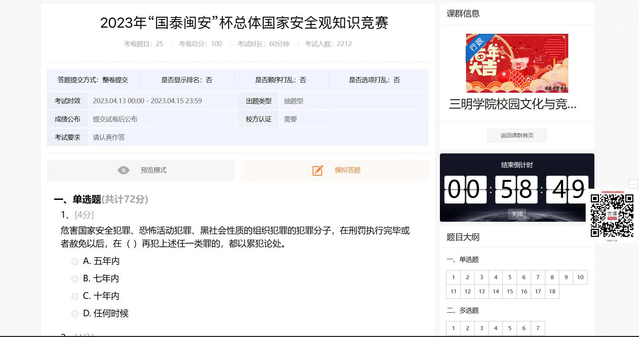 一项高质量知识竞赛。学校依托易班网开展“2023年‘国泰明安’杯总体国家安全观知识竞赛”,全校共有2000余名同学参加,这是学生喜闻乐见的方式,在激发学习安全知识兴趣得同时,也为我校师生拓展了获取安全知识的渠道,达到了以赛促学的积极效果。