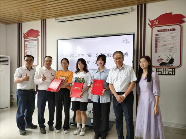 近日,2022海峡两岸大学生“福”文化文创设计大赛颁奖典礼在理工三410会议室举行,台湾中国科技大学吕英瑞教务长、王再生执行长、陈鼎周主任出席颁奖典礼,并为获奖学生代表颁奖。