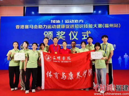 中新网福建新闻7月1日电 (董健 罗雅婷)近日,由中国体育科学学会、国家体育总局体育科学研究所、福建省体育局、福建省卫生健康委员会主办的运动健康促进知识技能大赛(福州站)比赛中,由三明学院体育与康养学院的8名学生和2名教师组成三明学院代表队荣获机构组团体总分第一名,其中廖俊辉老师从94名参赛选手脱颖而出,获得个人组第三名的好成绩。