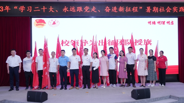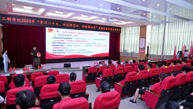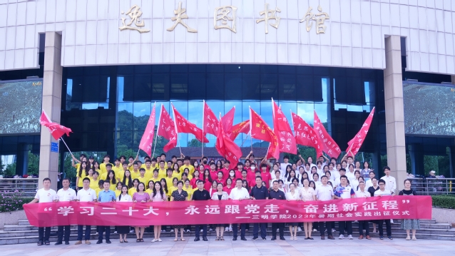 7月4日下午,三明学院2023年“学习二十大、永远跟党走、奋进新征程”暑期社会实践活动出征仪式在图书馆学术报告厅举行。校党委副书记廖景榕出席仪式并为社会实践团队授旗,组织部、宣传部、学生处、校团委、马克思主义学院负责人,各二级学院团委负责人及实践团队学生代表共计200余人参加本次出征仪式。