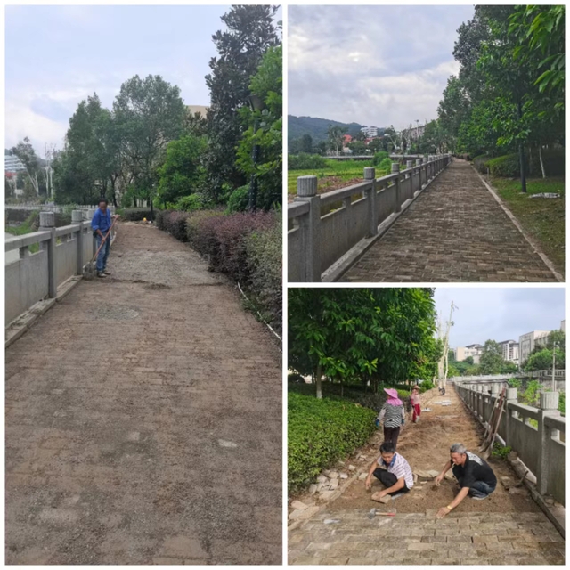 扁担溪沿河透水砖维修工程正在施工,8月底完工,将为学校师生提供休闲散步好去处。