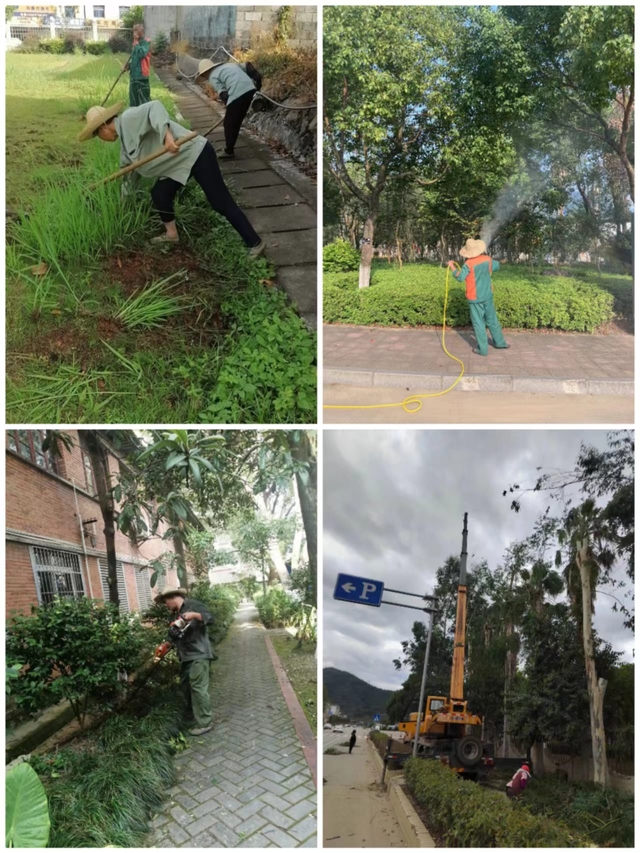 夏季高温多晒,植物极易脱水死亡,因此是绿化养护任务最繁重的季节。为了保持优美的校园环境,绿化养护人员头顶烈日,进行枝叶修剪、杂草清理、草坪洒水,抓紧对树木进行加固支撑、截干修枝和病虫害防治,做好防台抗旱工作。他们不怕苦不怕累,用双手呵护着烈日下的校园绿色,目前已完成校园118棵桉树截杆修枝。同时,物业保洁人员不畏酷暑,暑期认真做好校园走廊、楼梯、墙面等区域全面的扫尘保洁,垃圾清运、道路清扫、环境消杀等工作正在有条不紊的进行中。