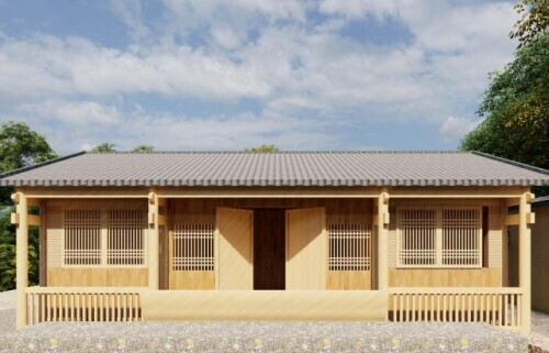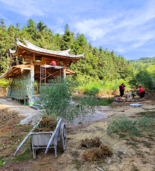 实践团队在带队老师的指导下,总结梳理出尤溪桂峰村、清流县东坑村17座书院特色元素,结合梓口坊村清水湾生态环境及建筑功能,将梁柱间架结构、门楼、斗拱、翘角、花托、雕花、意境的含蕴等书院DNA元素重构融入到“梧竹小筑”观鸟点微景观营造作品中,建筑主要使用木材、竹材和茅草建造而成,高约6米,宽约4米,长约7.5米,周边运用竹子、砖瓦、石子、石头进行造景,营造天人合一、道法自然的原始生态,建筑入口匾额、牌楼以及花托等部件由书院DNA元素转译而来,释放出浓浓的传统文化气息,精致的木质板材能够很好地适应天气状况,为这个塑性的几何形式创造出柔软、自然的立面效果。