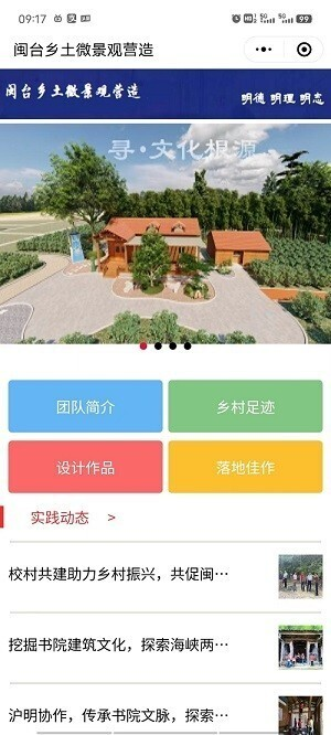 实践团队主动适应数字化、智能化、终身化、融合化发展趋势,深入挖掘本次社会实践中的思政元素,融入吃苦耐劳、勇于创新、甘于奉献的精神,运用信息技术手段设计开发“闽台乡土微景观营造”微信小程序,将团队乡村足迹、50余份设计CAD图纸、落地作品以及实践动态成体系展示,用生动实践案例、丰富实践成果感染大学生,吸引更多青年学子加入实践队伍,拓宽受益青年学生群体,目前微信小程序已上线。