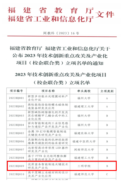 2023年8月18日,福建省教育厅、福建省工业和信息化厅公布了2023年技术创新重点攻关及产业化项目(校企联合类)立项名单,三明学院信息工程学院与机电工程学院联合申报的“优质盘条智能制造关键技术研发及产业化”(2023XQ009)项目获得B类立项,补助资金200万元。该项目合作企业为福建省三钢(集团)有限责任公司,这是我校深化产教融合,探索整合校内资源、共同高质量服务地方企业模式方面迈出的关键一步。