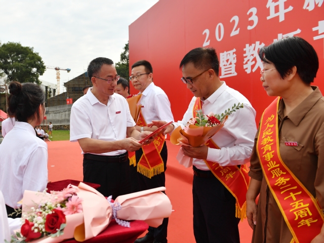 典礼上,王乾廷校长代表校党委向2023级新生和新入职的教师表示衷心祝贺和热烈欢迎,并祝贺全体教职工第39个教师节快乐。他指出,加快建设教育强国的号角已经吹响。强国必先强教,强教必先强师。希望全体教师深入学习贯彻习近平总书记给全国优秀教师代表的致信精神,大力弘扬教育家精神,牢记为党育人、为国育才的初心使命,树立“躬耕教坛、强国有我”的志向和抱负,做一名“合格”的教师,自信自强、踔厉奋发,为强国建设、民族复兴伟业作出新的更大贡献。
