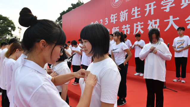 典礼在庄严的国歌声中拉开了帷幕。在入学入职仪式上,新生代表、新入职教师代表分别接受老生代表、离退休教师亲手佩戴校徽,并进行庄严宣誓。