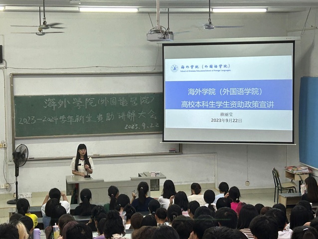 为贯彻落实高校资助政策,提升资助育人成效,发挥受助学生典型示范和引领作用,9月22日,海外学院(外国语学院)在鸿文楼101开展了2023年学生资助政策宣讲会,2023级全体新生参加。