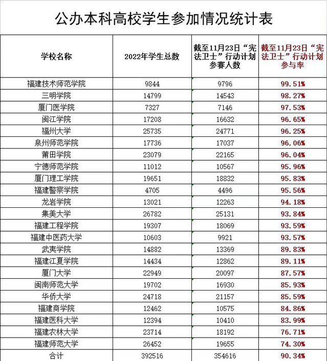 依托教育部全国青少年普法网,鼓励引导广大学生积极参加2022年第七届全国学生“学宪法 讲宪法”网络学习和“宪法卫士”行动计划。学校设立一级管理员1人,各学院设置二级管理员1人,专门负责此项工作。按照要求完成“学习练习”“综合评价”“法治实践”三项内容。截至目前为止,在校学生参与率已达到98.27%,约14000余人,暂列全省公办本科高校学生参加率排名第二位。我校还积极选拔学生代表参加第七届全省学生“学宪法讲宪法”遴选活动。