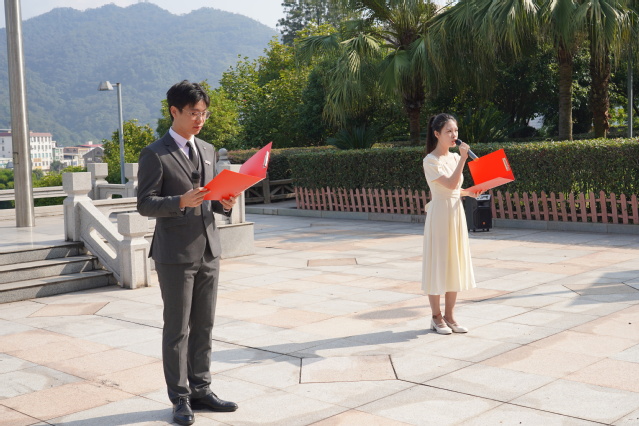 在飘扬的国旗下,文化传播学院罗艺行、陈柔熹同学一首慷慨激昂的《青春中国》,表达新时代明院人担当为先的情怀,展现新时期青年学子自信高昂的精神风貌。升旗仪式在“闽师百廿传承不息,强国复兴征程有我”的铮铮誓言中落下帷幕。