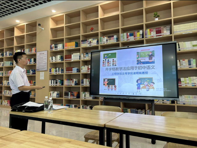 为了加强大学和中学语文教育的衔接,创新教学内容方法,近日,三明学院文化传播学院谢明辉教授受邀在三明一中陈景润初中部作了一场题为《井字格教学法应用于初中语文》的专题讲座,推开“万物皆可取名”的大门,向大家展示融合了中华传统文化元素的井字格教学法。三明一中副校长李祖鸿、全体语文教师、三明学院汉语言文学师范专业的实习生共计三十人参加本次讲座。